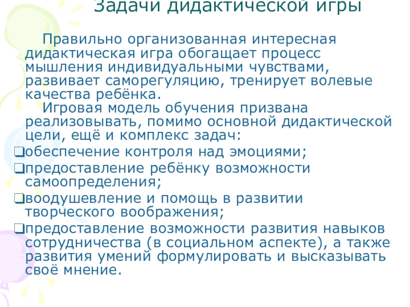 чувствами, развивает саморегуляцию, тренирует волевые качества ребёнка. Игровая модель обучения призвана реализовывать, помимо основной дидактической цели, ещё и комплекс задач: