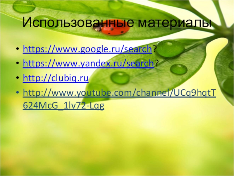Использованные материалыhttps://www.google.ru/search?https://www.yandex.ru/search?http://clubiq.ruhttp://www.youtube.com/channel/UCq9hqtT624McG_1lv72-Lqg