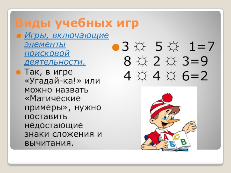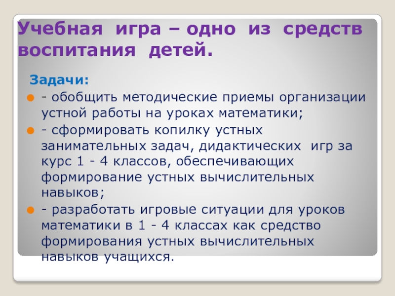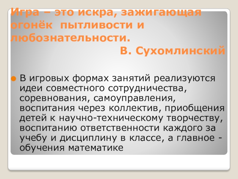 В игровых формах занятий реализуются идеи совместного сотрудничества, соревнования, самоуправления, воспитания через коллектив, приобщения детей к научно-техническому творчеству, воспитанию ответственности каждого за учебу и дисциплину в классе, а главное - обучения математике
