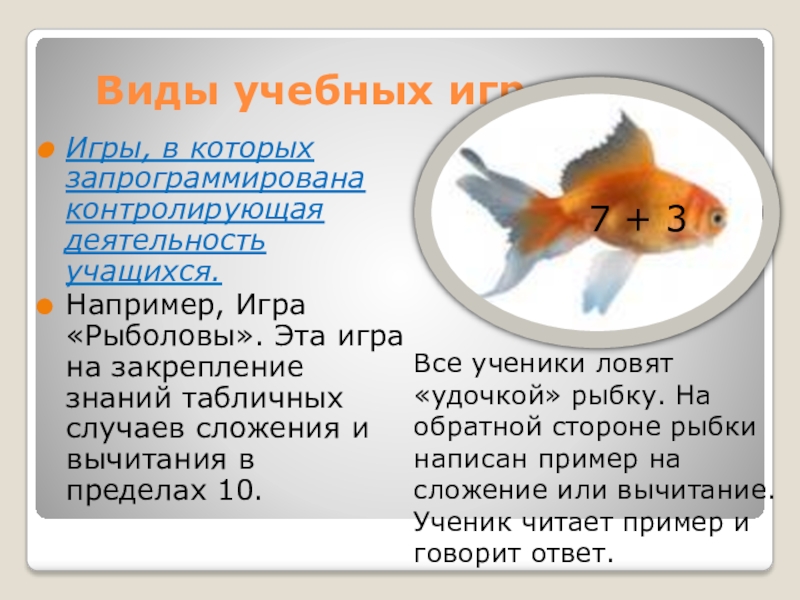 Все ученики ловят «удочкой» рыбку. На обратной стороне рыбки написан пример на сложение или вычитание. Ученик читает пример и говорит ответ.