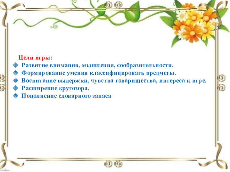 Цели игры:  Развитие внимания, мышления, сообразительности. Формирование умения классифицировать предметы.  Воспитание выдержки, чувства товарищества, интереса к игре. Расширение кругозора. Пополнение словарного запаса