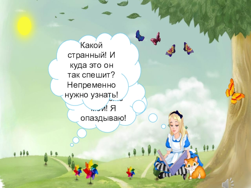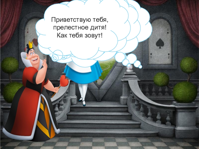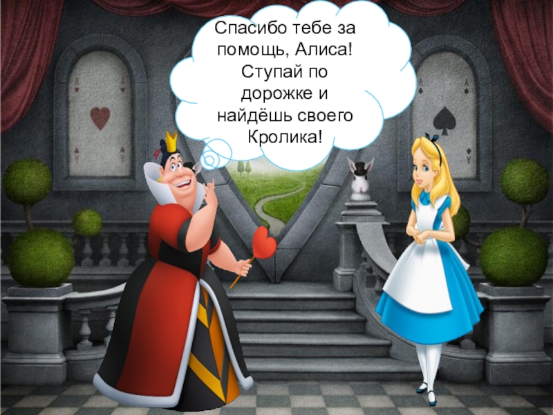 Здравствуйте, Ваше Величество! Я - Алиса! И я ищу Белого Кролика! Вы не знаете, куда он убежал?