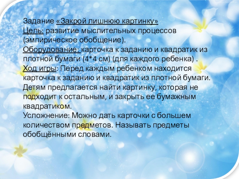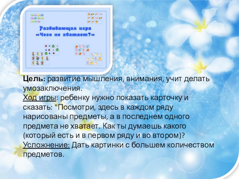 Слайд 8Цель: развитие мышления, внимания, учит делать умозаключения.