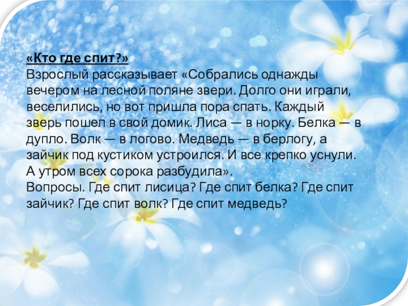 Вопросы. Где спит лисица? Где спит белка? Где спит зайчик? Где спит волк? Где спит медведь?