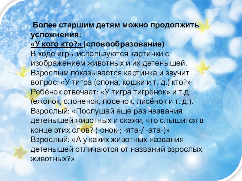 Взрослым показывается картинка и звучит вопрос: «У тигра (слона, кошки и т. д.) кто?»
