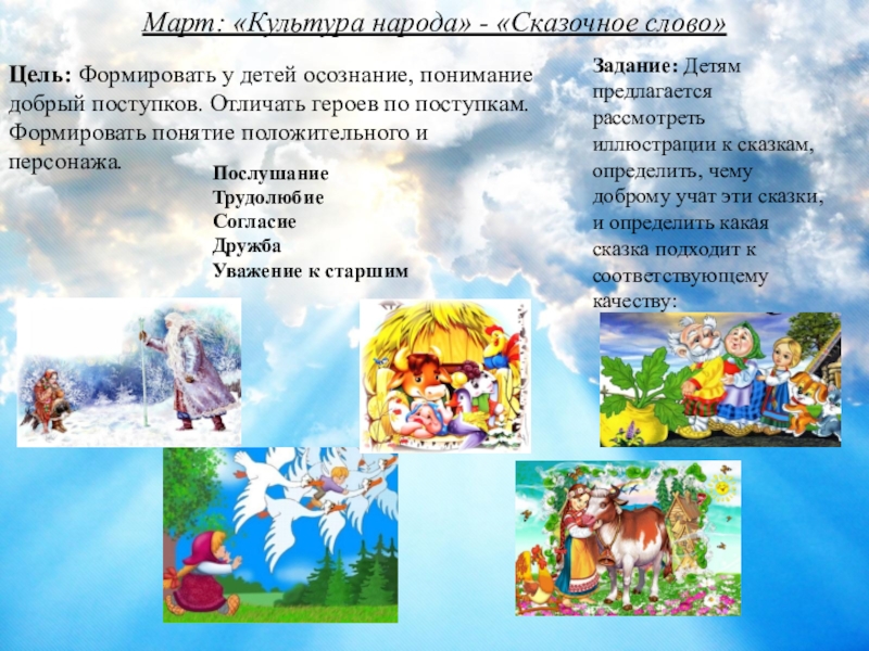 Задание: Детям предлагается рассмотреть иллюстрации к сказкам, определить, чему доброму учат эти сказки, и определить какая сказка подходит к соответствующему качеству: