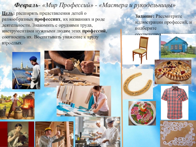 Цель: расширять представления детей о разнообразных профессиях, их названиях и роде деятельности. Знакомить с орудиями труда, инструментами нужными людям этих профессий, соотносить их. Воспитывать уважение к труду взрослых.