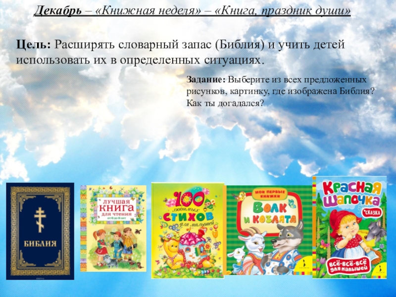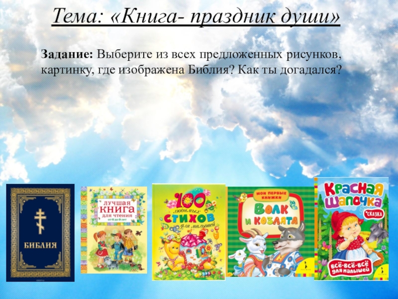 Задание: Выберите из всех предложенных рисунков, картинку, где изображена Библия? Как ты догадался?