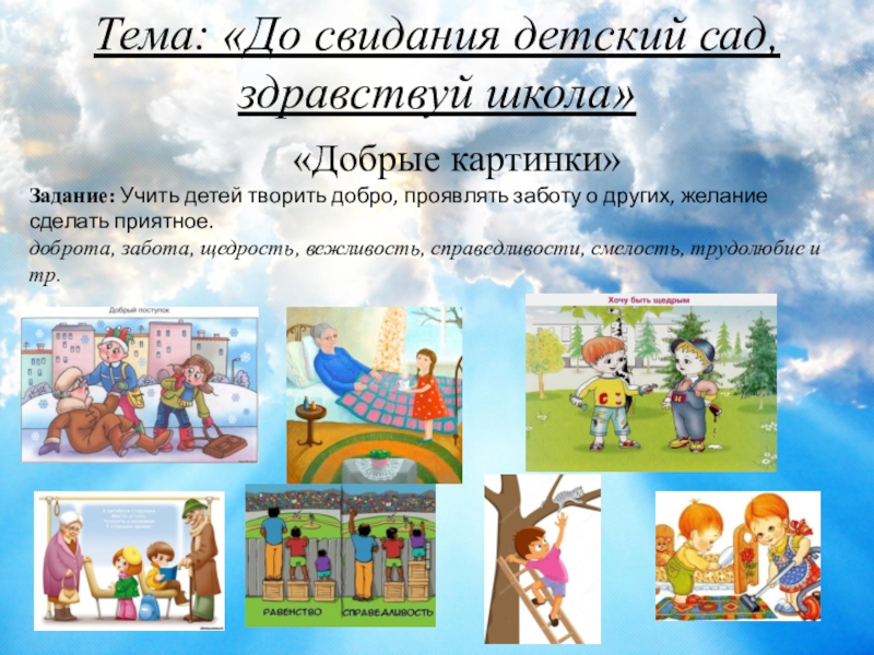 Цель: Формировать у детей осознание, понимание добрый поступков. Отличать героев по поступкам. Формировать понятие положительного и персонажа.
