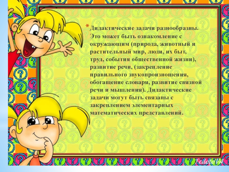 Слайд 4Дидактические задачи разнообразны. Это может быть ознакомление с окружающим (природа, животный
