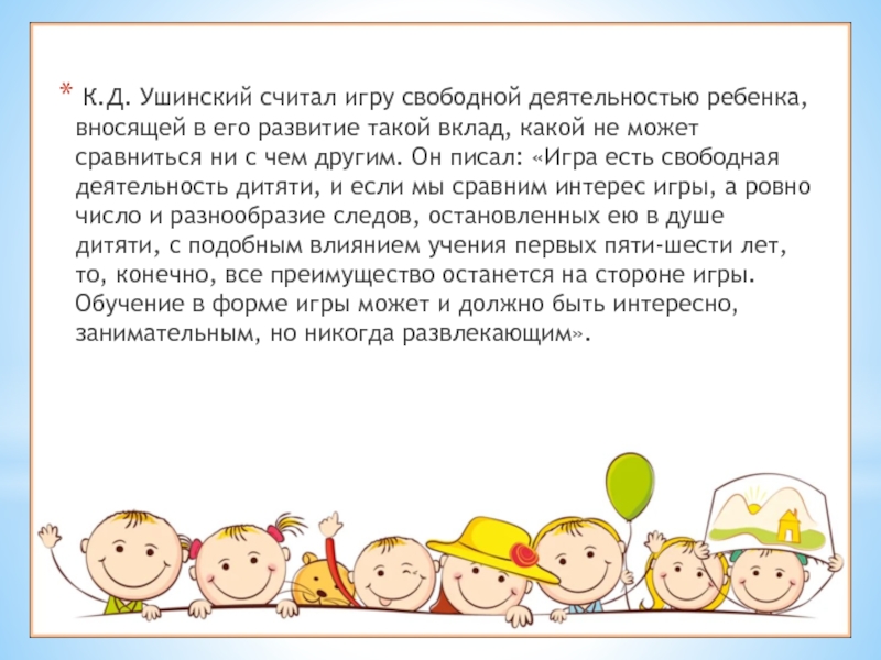 Слайд 2 К.Д. Ушинский считал игру свободной деятельностью ребенка, вносящей в его