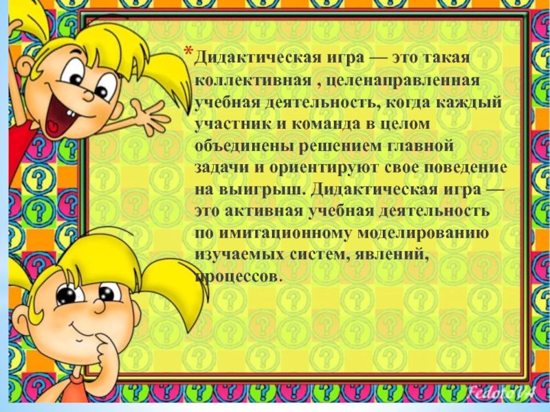участник и команда в целом объединены решением главной задачи и ориентируют свое поведение на выигрыш. Дидактическая игра — это активная учебная деятельность по имитационному моделированию изучаемых систем, явлений, процессов.