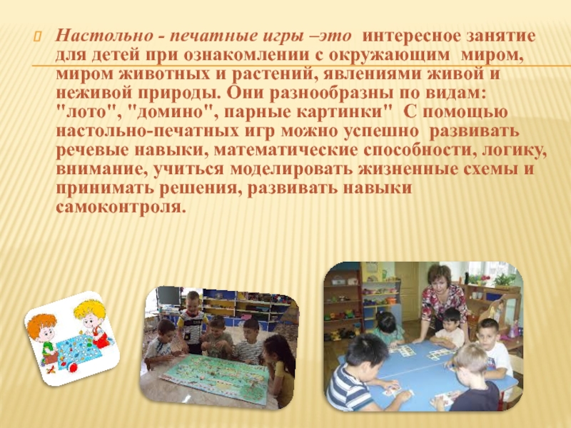 Слайд 9Настольно - печатные игры –это интересное занятие для детей при ознакомлении с окружающим
