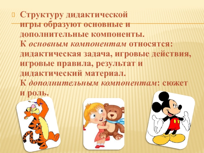 игровые действия, игровые правила, результат и дидактический материал. К дополнительным компонентам: сюжет и роль.