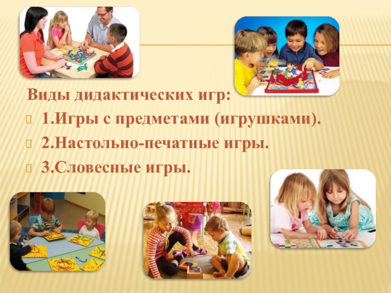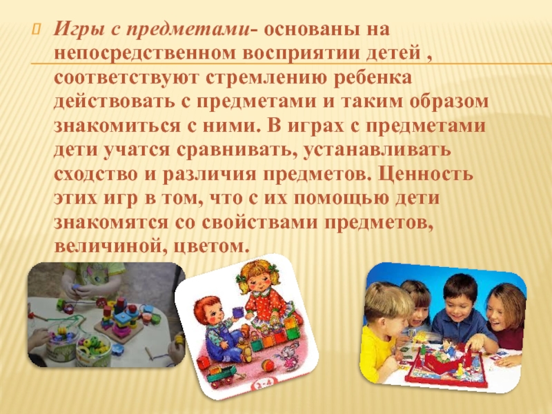 Слайд 8Игры с предметами- основаны на непосредственном восприятии детей , соответствуют стремлению