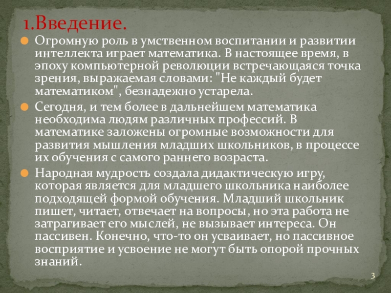 Народная мудрость создала дидактическую игру, которая является для младшего школьника наиболее подходящей формой обучения. Младший школьник пишет, читает, отвечает на вопросы, но эта работа не затрагивает его мыслей, не вызывает интереса. Он пассивен. Конечно, что-то он усваивает, но пассивное восприятие и усвоение не могут быть опорой прочных знаний.