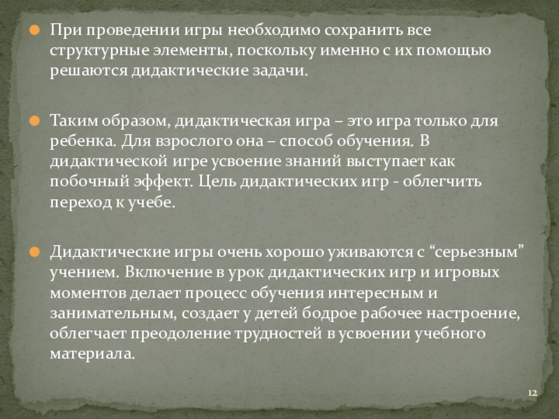 Слайд 12При проведении игры необходимо сохранить все структурные элементы, поскольку именно с