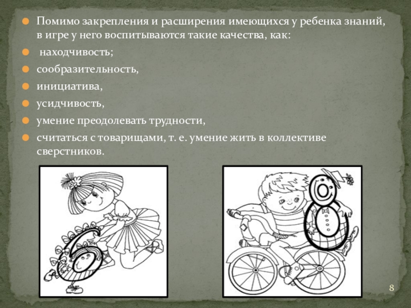 Слайд 8Помимо закрепления и расширения имеющихся у ребенка знаний, в игре у