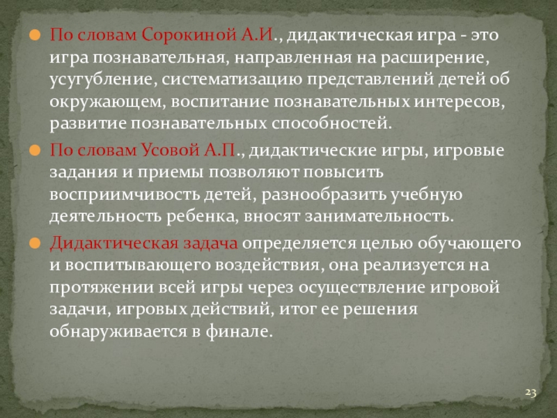 Слайд 23По словам Сорокиной А.И., дидактическая игра - это игра познавательная, направленная