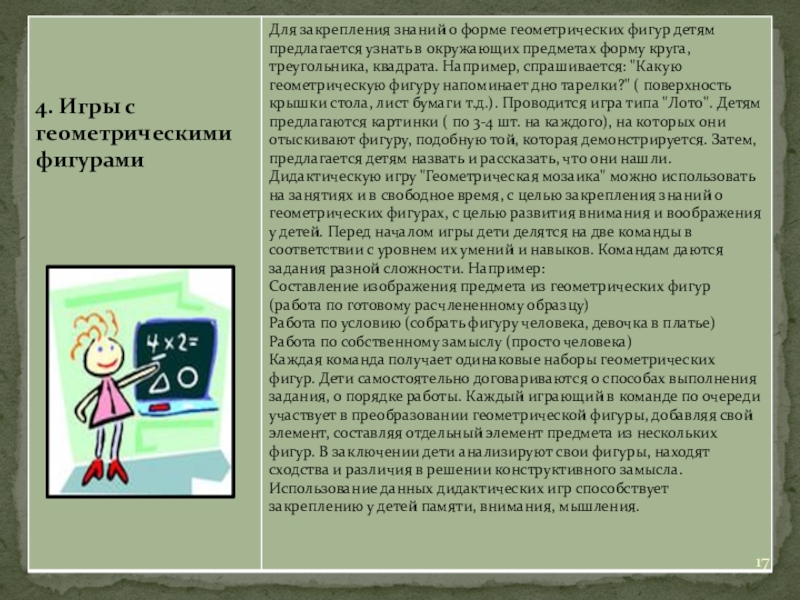 5.Разработка и усовершенствование дидактических игр в зависимости от цели и задач математического занятия.