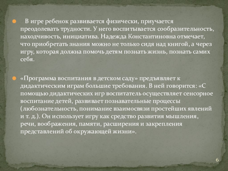 него воспитывается сообразительность, находчивость, инициатива. Надежда Константиновна отмечает, что приобретать знания можно не только сидя над книгой, а через игру, которая должна помочь детям познать жизнь, познать самих себя.