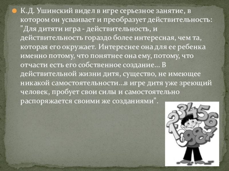Слайд 4К.Д. Ушинский видел в игре серьезное занятие, в котором он усваивает