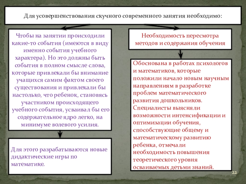 Обоснована в работах психологов и математиков, которые положили начало новым научным направлениям в разработке проблем математического развития дошкольников. Специалисты выясняли возможности интенсификации и оптимизации обучения, способствующие общему и математическому развитию ребенка, отмечали необходимость повышения теоретического уровня осваиваемых детьми знаний.