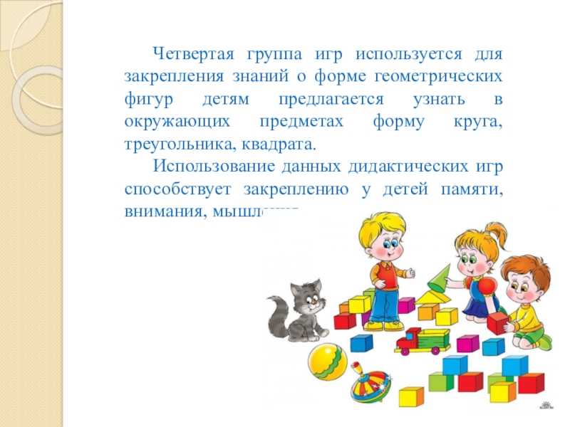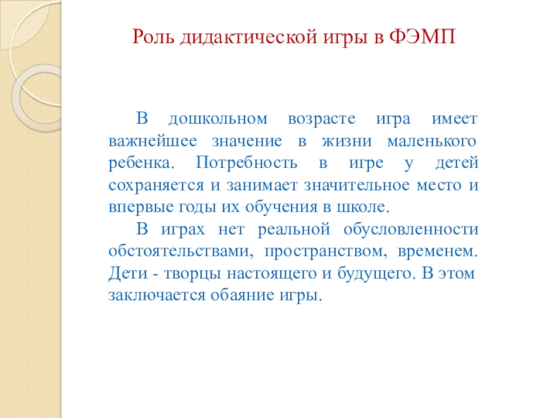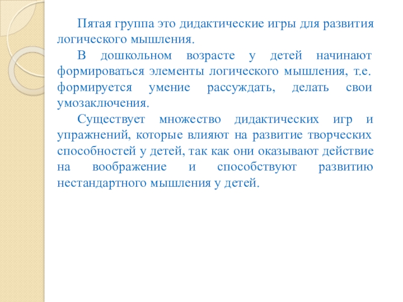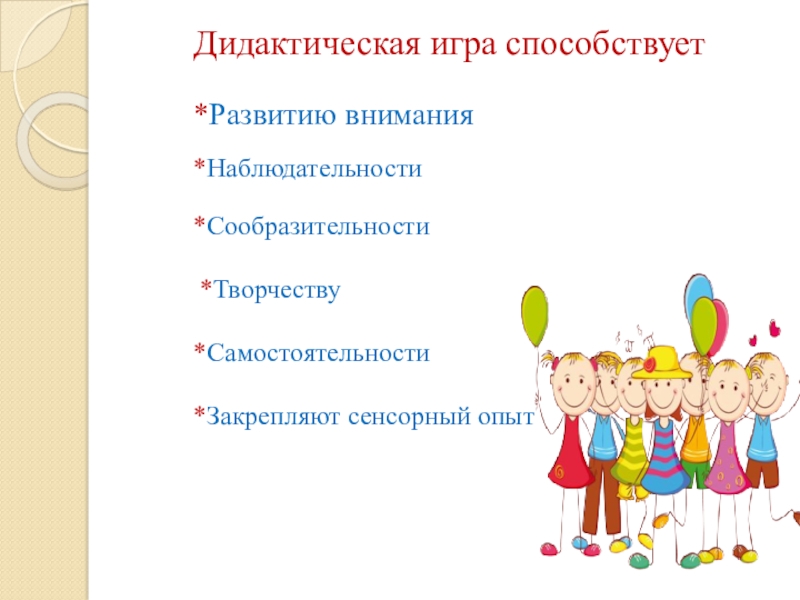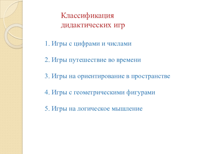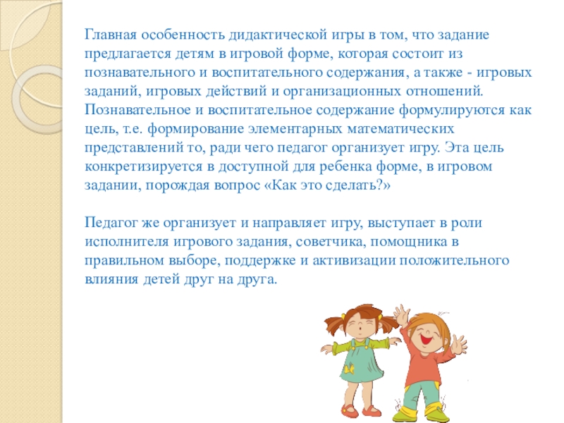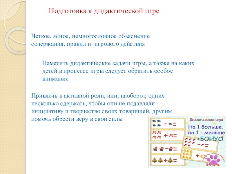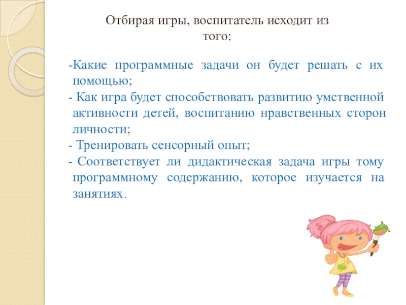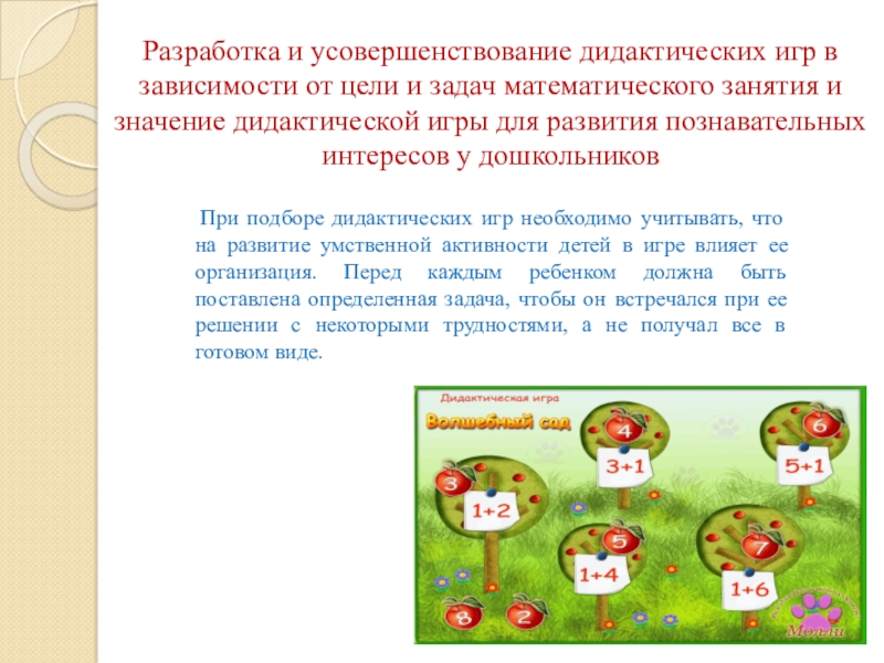 При подборе дидактических игр необходимо учитывать, что на развитие умственной активности детей в игре влияет ее организация. Перед каждым ребенком должна быть поставлена определенная задача, чтобы он встречался при ее решении с некоторыми трудностями, а не получал все в готовом виде.