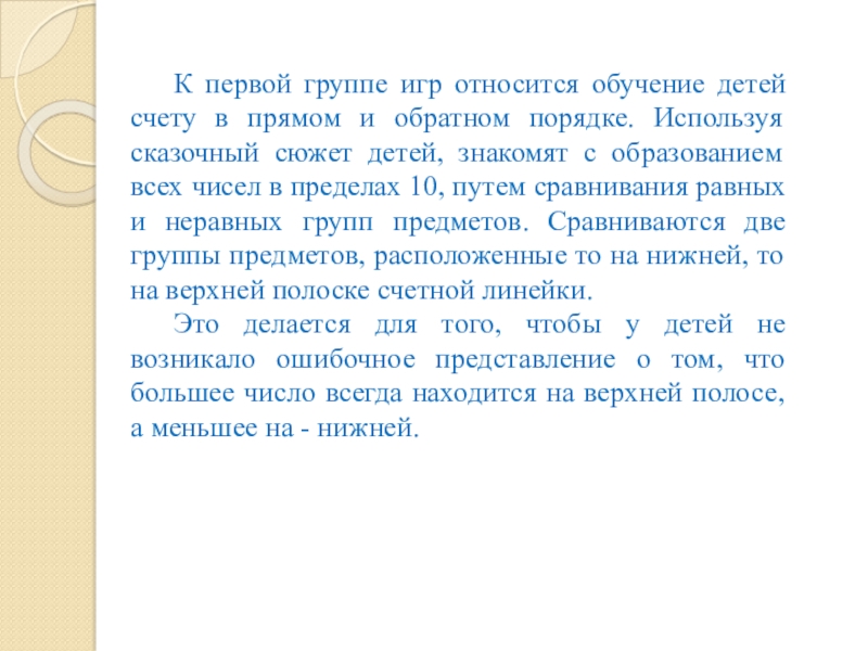 Используются игры, в которых игровое действие является в то же время элементарным математическим действием – «Найди столько же!», «Разложи по порядку!» и др.