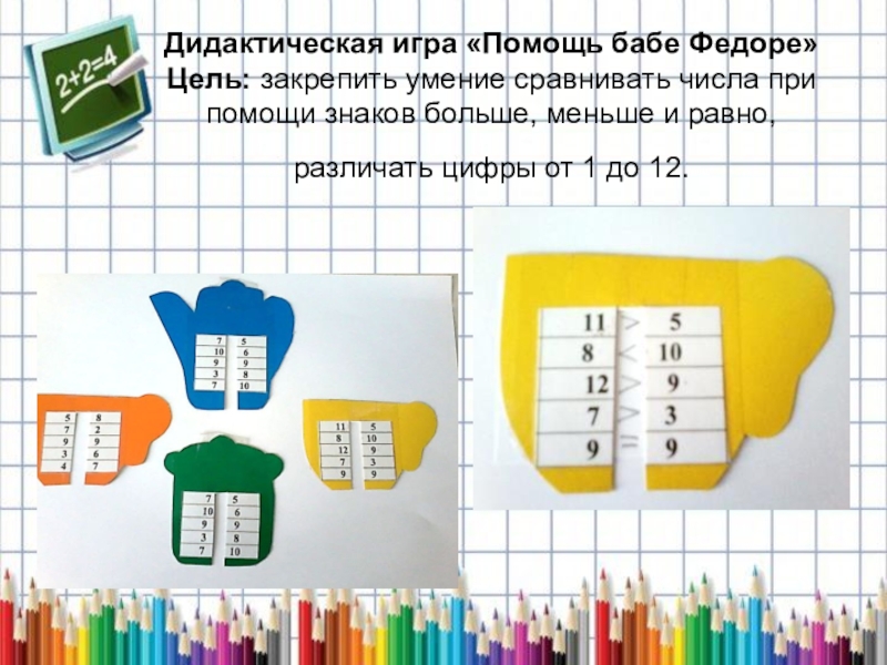 Слайд 14Дидактическая игра «Помощь бабе Федоре» Цель: закрепить умение сравнивать числа при помощи