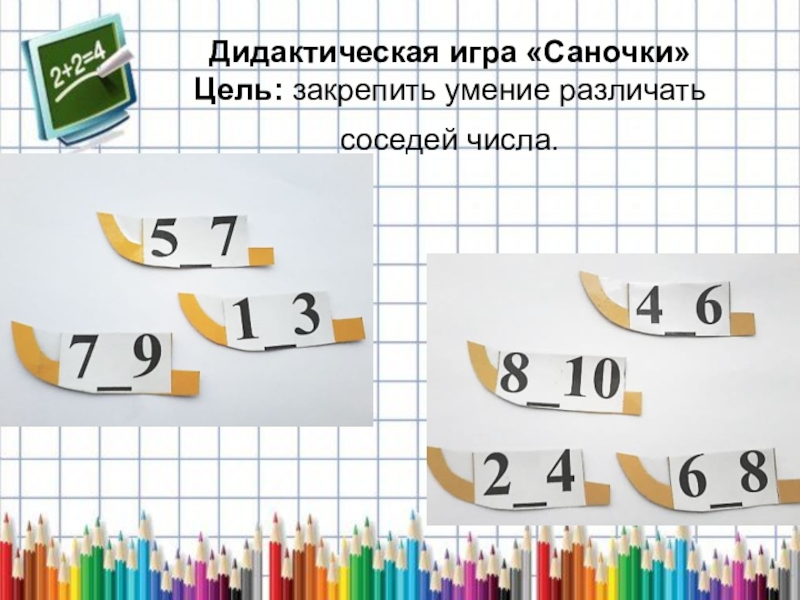 Слайд 11Дидактическая игра «Саночки» Цель: закрепить умение различать соседей числа.