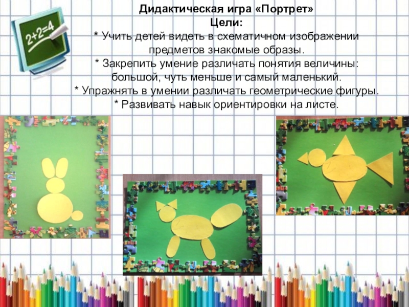 Дидактическая игра «Портрет»  Цели: * Учить детей видеть в схематичном изображении предметов знакомые образы. * Закрепить умение