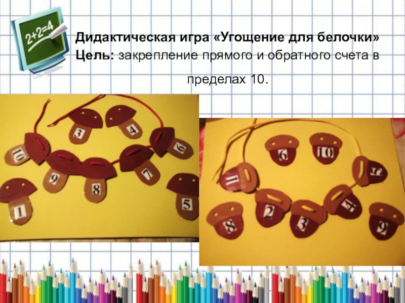 Слайд 13Дидактическая игра «Угощение для белочки» Цель: закрепление прямого и обратного счета в