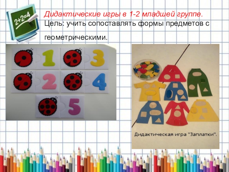 Слайд 2Дидактические игры в 1-2 младшей группе. Цель: учить сопоставлять формы предметов с