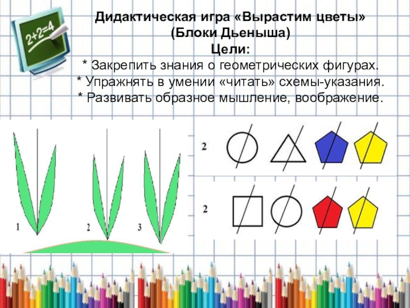 Слайд 18Дидактическая игра «Вырастим цветы» (Блоки Дьеныша) Цели: * Закрепить знания о геометрических фигурах. * Упражнять