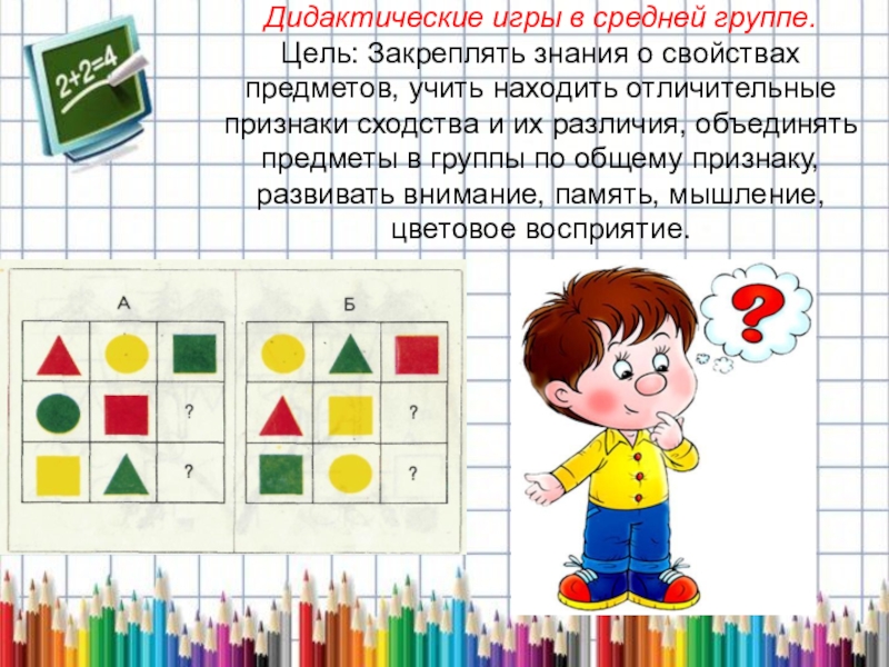 Дидактические игры в средней группе. Цель: Закреплять знания о свойствах предметов, учить находить отличительные признаки сходства и