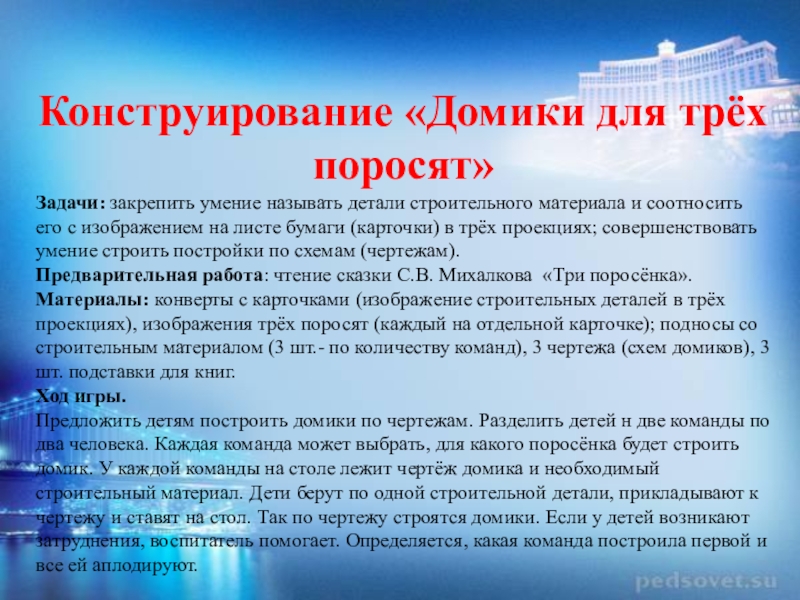 Материалы: конверты с карточками (изображение строительных деталей в трёх проекциях), изображения трёх поросят (каждый на отдельной карточке); подносы со строительным материалом (3 шт.- по количеству команд), 3 чертежа (схем домиков), 3 шт. подставки для книг.