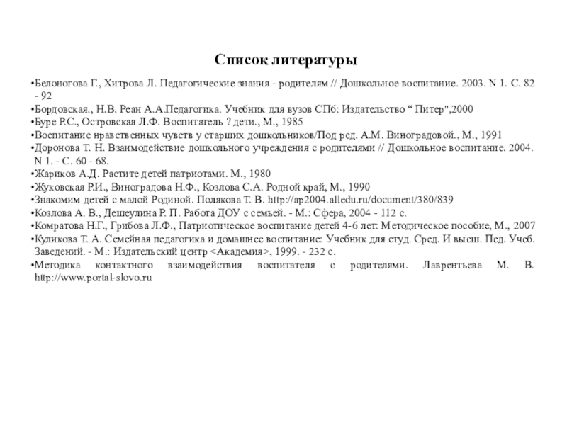 Доронова Т. Н. Взаимодействие дошкольного учреждения с родителями // Дошкольное воспитание. 2004. N 1. - С. 60 - 68.