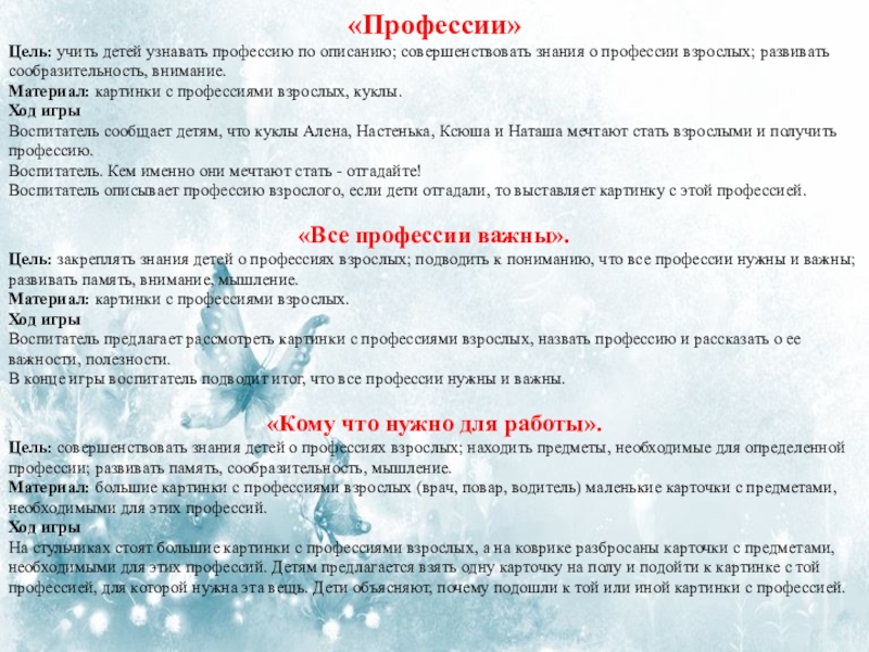 Цель: закреплять знания детей о профессиях взрослых; подводить к пониманию, что все профессии нужны и важны; развивать память, внимание, мышление.