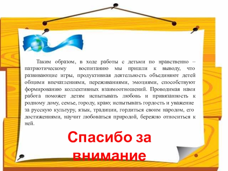 Слайд 19 Таким образом, в ходе работы с детьми по нравственно – патриотическому