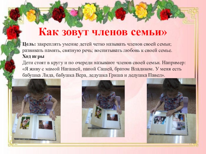 Дети стоят в кругу и по очереди называют членов своей семьи. Например: «Я живу с мамой Наташей, папой Сашей, братом Владиком. У меня есть бабушка Лида, бабушка Вера, дедушка Гриша и дедушка Павел».