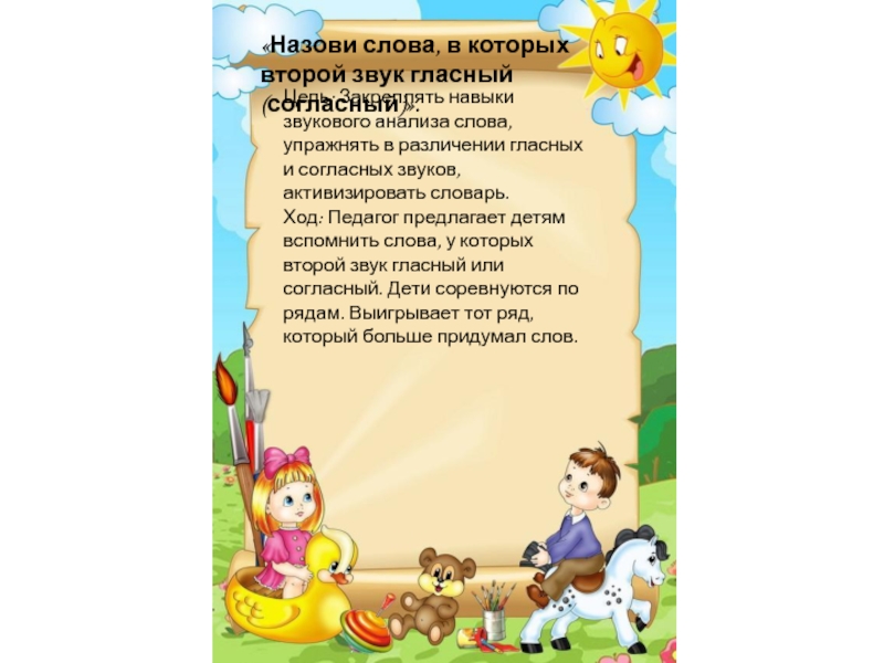 «Назови слова, в которых второй звук гласный (согласный)».