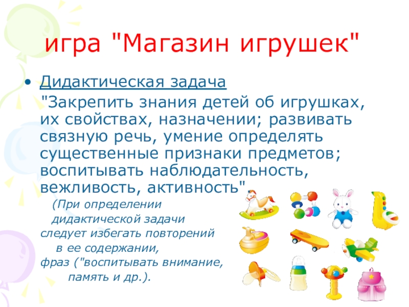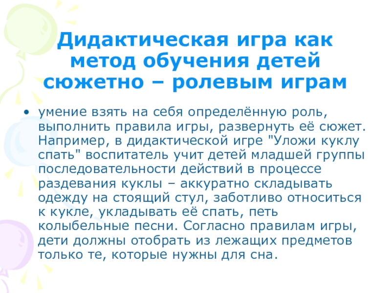 на себя определённую роль, выполнить правила игры, развернуть её сюжет. Например, в дидактической игре "Уложи куклу спать" воспитатель учит детей младшей группы последовательности действий в процессе раздевания куклы – аккуратно складывать одежду на стоящий стул, заботливо относиться к кукле, укладывать её спать, петь колыбельные песни. Согласно правилам игры, дети должны отобрать из лежащих предметов только те, которые нужны для сна.