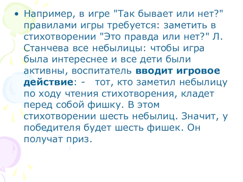 в стихотворении "Это правда или нет?" Л.Станчева все небылицы: чтобы игра была интереснее и все дети были активны, воспитатель вводит игровое действие: - тот, кто заметил небылицу по ходу чтения стихотворения, кладет перед собой фишку. В этом стихотворении шесть небылиц. Значит, у победителя будет шесть фишек. Он получат приз.