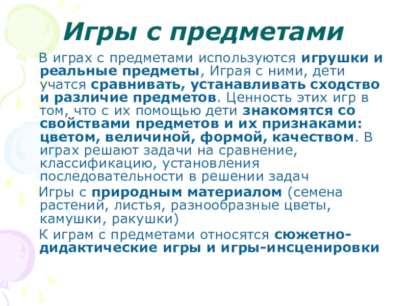 К играм с предметами относятся сюжетно-дидактические игры и игры-инсценировки
