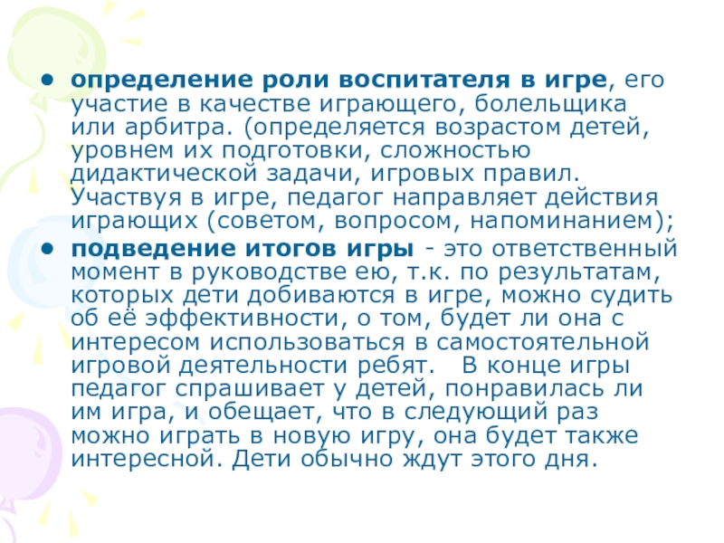 Слайд 22определение роли воспитателя в игре, его участие в качестве играющего, болельщика