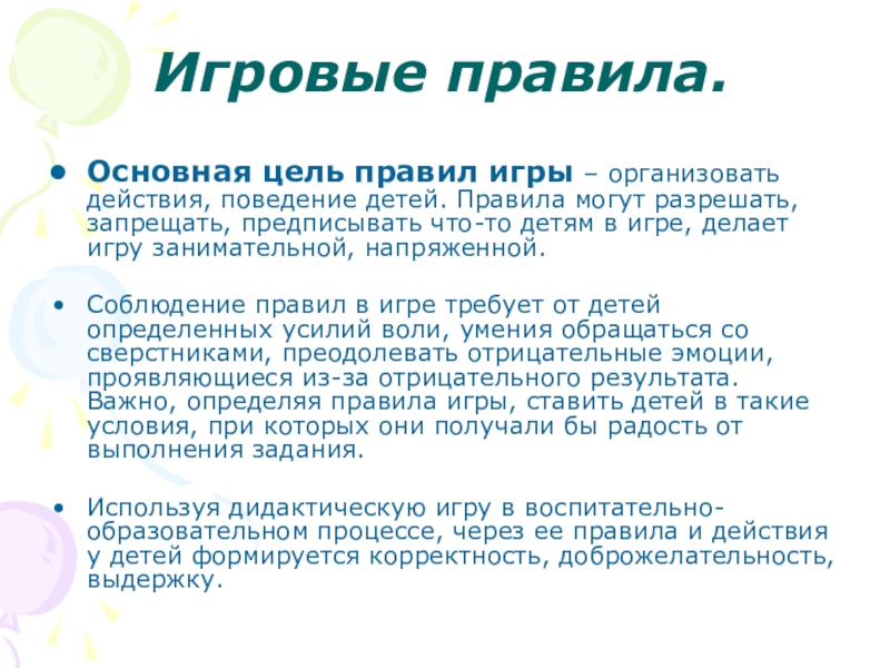 Основная цель правил игры – организовать действия, поведение детей. Правила