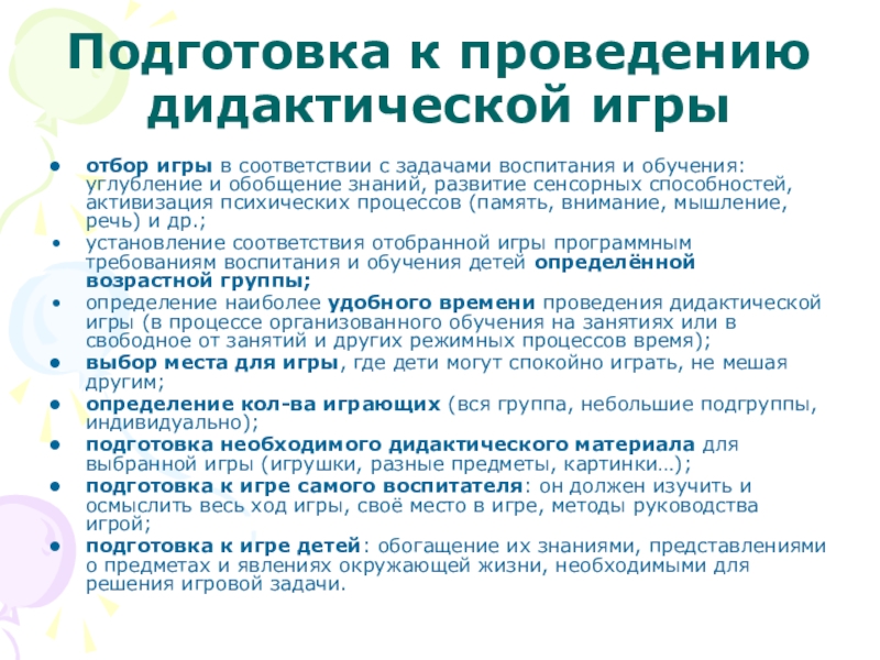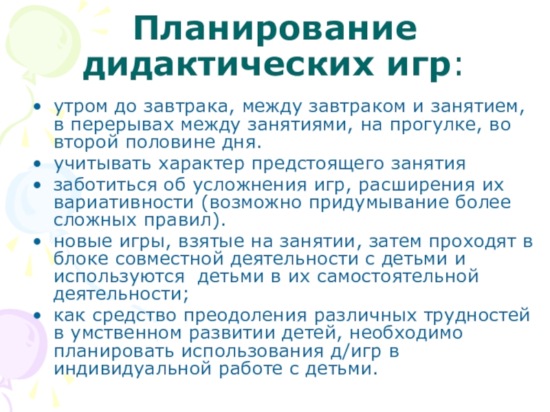 определение наиболее удобного времени проведения дидактической игры (в процессе организованного обучения на занятиях или в свободное от занятий и других режимных процессов время);