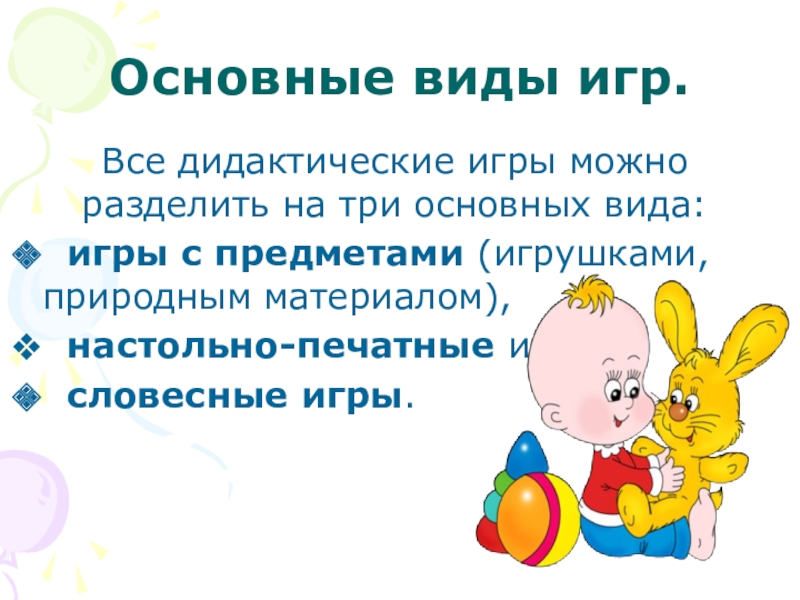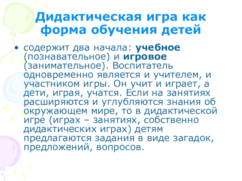 игровое (занимательное). Воспитатель одновременно является и учителем, и участником игры. Он учит и играет, а дети, играя, учатся. Если на занятиях расширяются и углубляются знания об окружающем мире, то в дидактической игре (играх – занятиях, собственно дидактических играх) детям предлагаются задания в виде загадок, предложений, вопросов.
