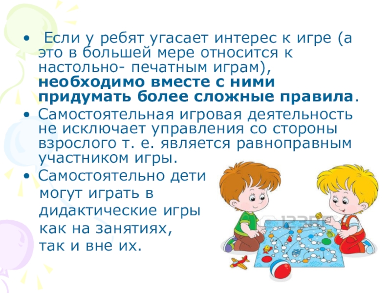 большей мере относится к настольно- печатным играм), необходимо вместе с ними придумать более сложные правила.
